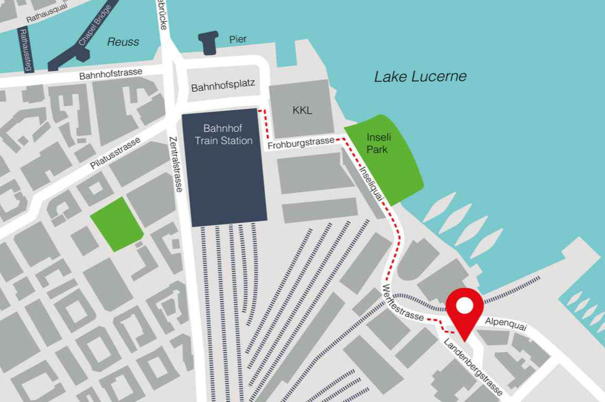 请搭乘火车前往卢塞恩火车站。请从KKL卢塞恩会议中心出口离开,沿Robert-Zünd-Strasse、Frohburgstrasse、Inseliquai和Werkhofstrasse前行。在Landenberg的巴士停车区等候。